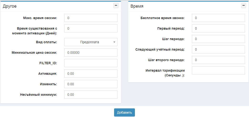 | Первый период: | Указать время в секундах, диапазон тарификации (пример, первые 30 с - бесплатно) |