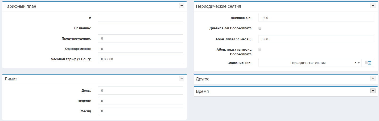| Списание Тип | Выбор типа списания для ТП. По умолчанию ID: 2 "Переодические платежи". Также можно выбрать галочку и система создаст новый тип списания для данного ТП (по его имени). |