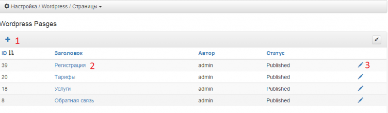 В пункте меню Настройка>Wordpress>Страницы отображается таблица со всеми страницами Wordpress-a.