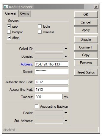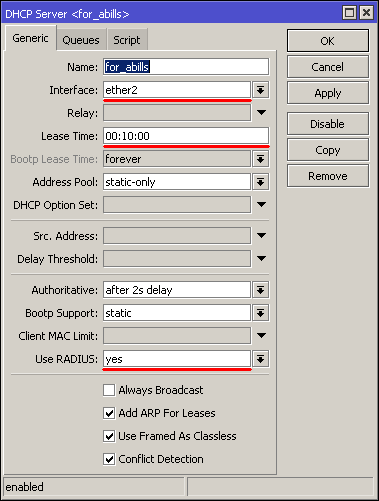 /ip dhcp-server add interface=ether2 address-pool=static-only authoritative=after-2sec-delay use-radius=yes lease-time=10m disabled=no /radius add address=192.168.1.62 secret=secretpass timeout=3000ms authentication-port=1812 accounting-port=1813 service=dhcp