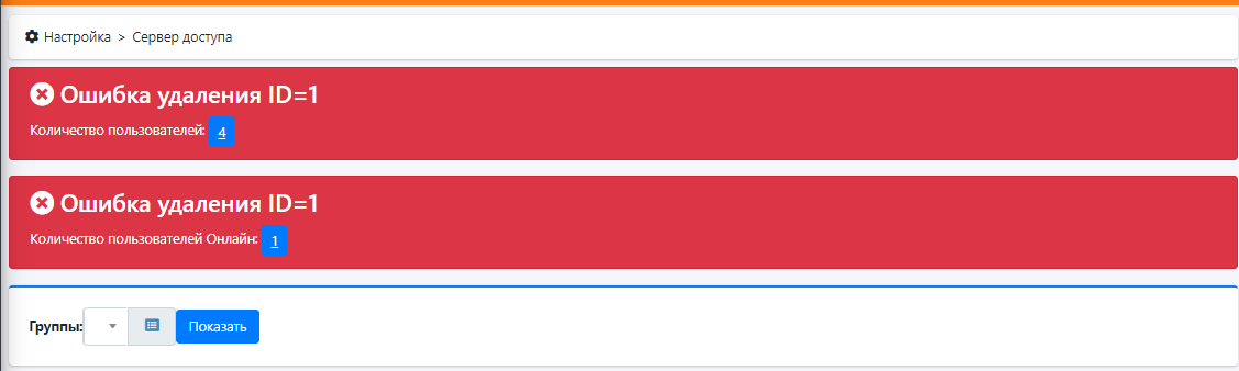 При клике на кнопку с количеством активных пользователей система перекинет в нужный список из заданной фильтрацией по ID сервера доступа. После отвязки пользователей от сервера его можно удалить