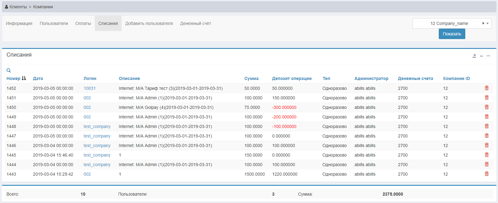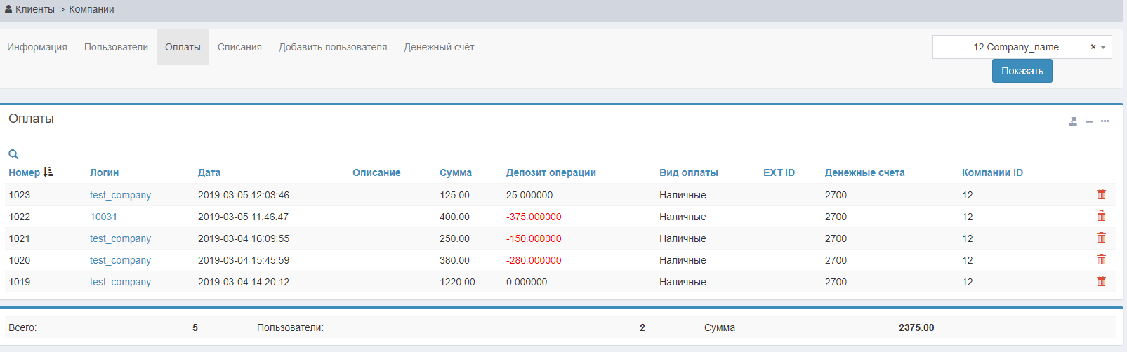 Для удаления компании нужно нажать на кнопку , но удаление будет доступно в том случае, если количество привязанных пользователей компании будет равно нулю.