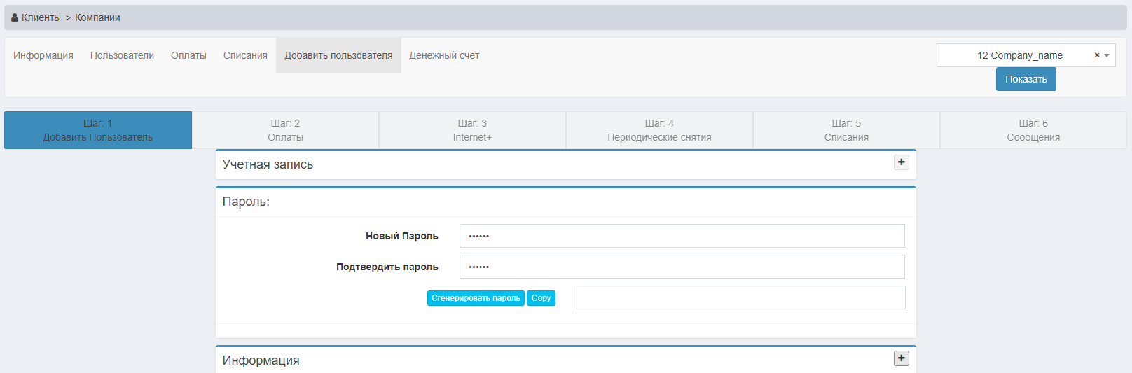 Добавить пользователя - добавление нового пользователя компании.