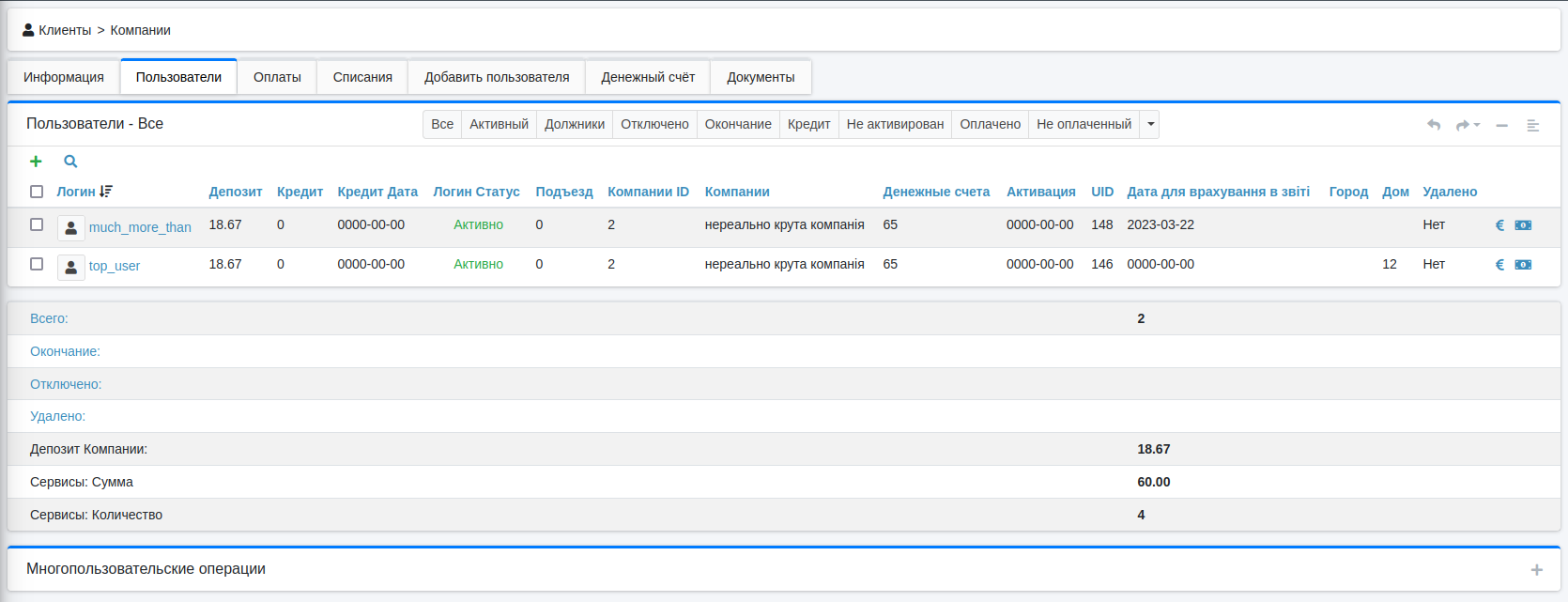 Пользователи - список пользователей компании + Многопользовательские операции.