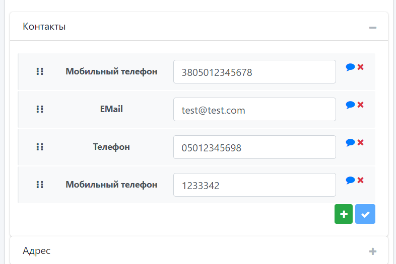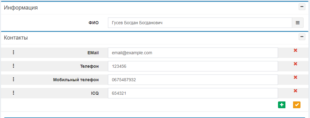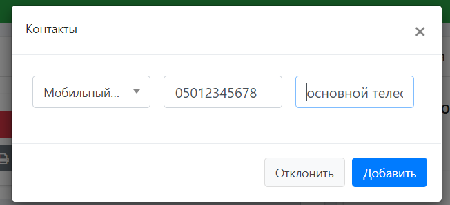 Форма позволяет добавлять контакты абонента любого типа и указывать несколько контактов одного типа.