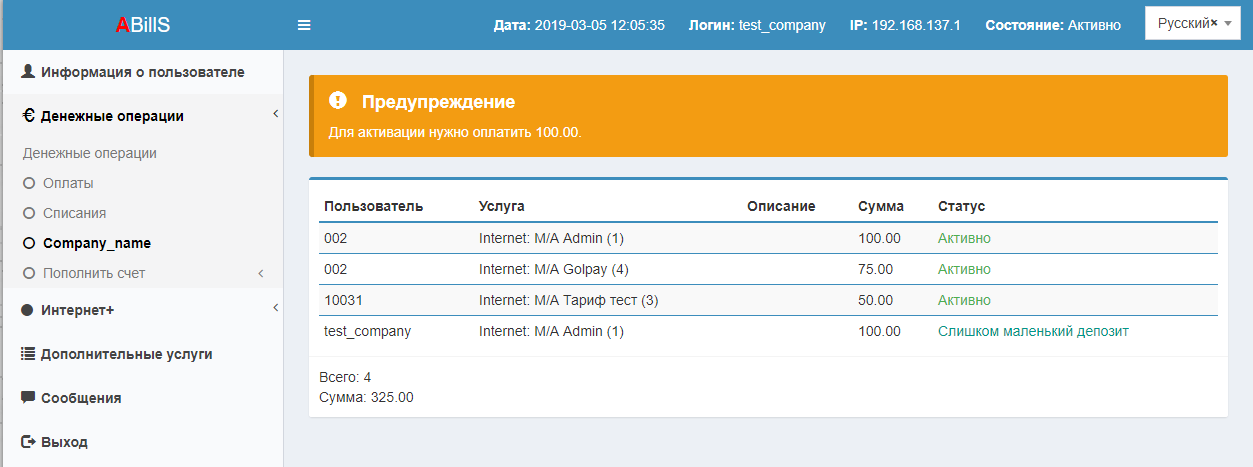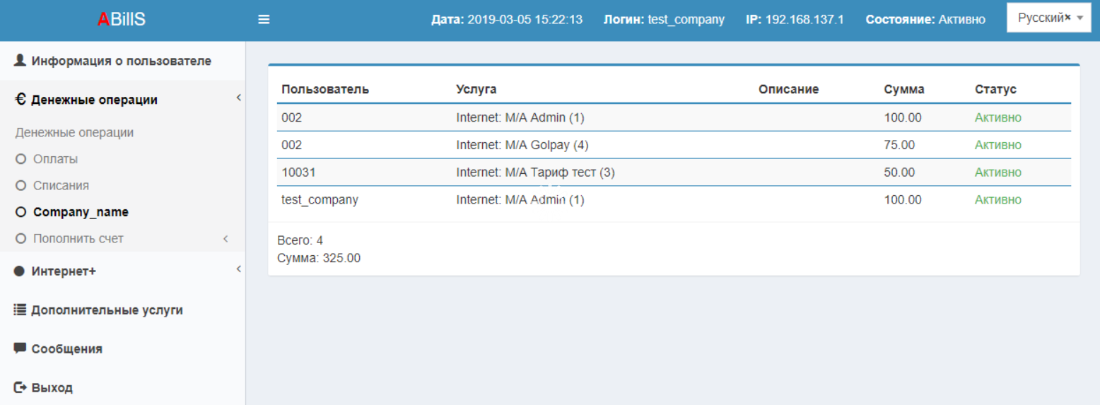 У пользователя, который назначен администратором компании, появится подменю с названием созданной ранее компании в пункте меню Денежные операции.
