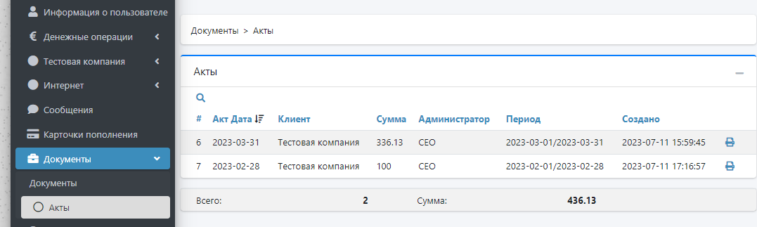 то в разделе Документы→Акты администратор компании будет видеть печатные формы актов компании