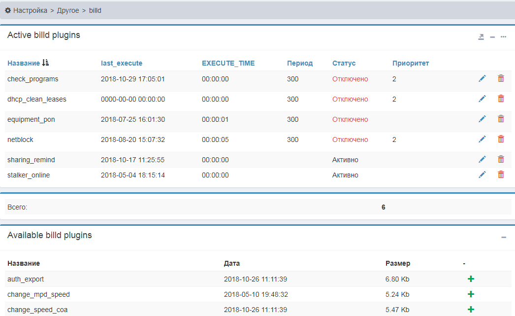 | Название: | Название плагина. Плагины размещаются в каталоге /usr/abills/libexec/billd.plugins |