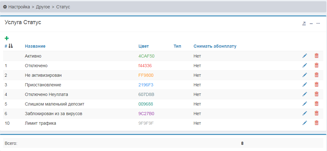 | Снимать абонплату | Если отмечена данная функция, то при переходе с выбранного статуса на статус «Активный» будет сниматься абонплата по сервису |
