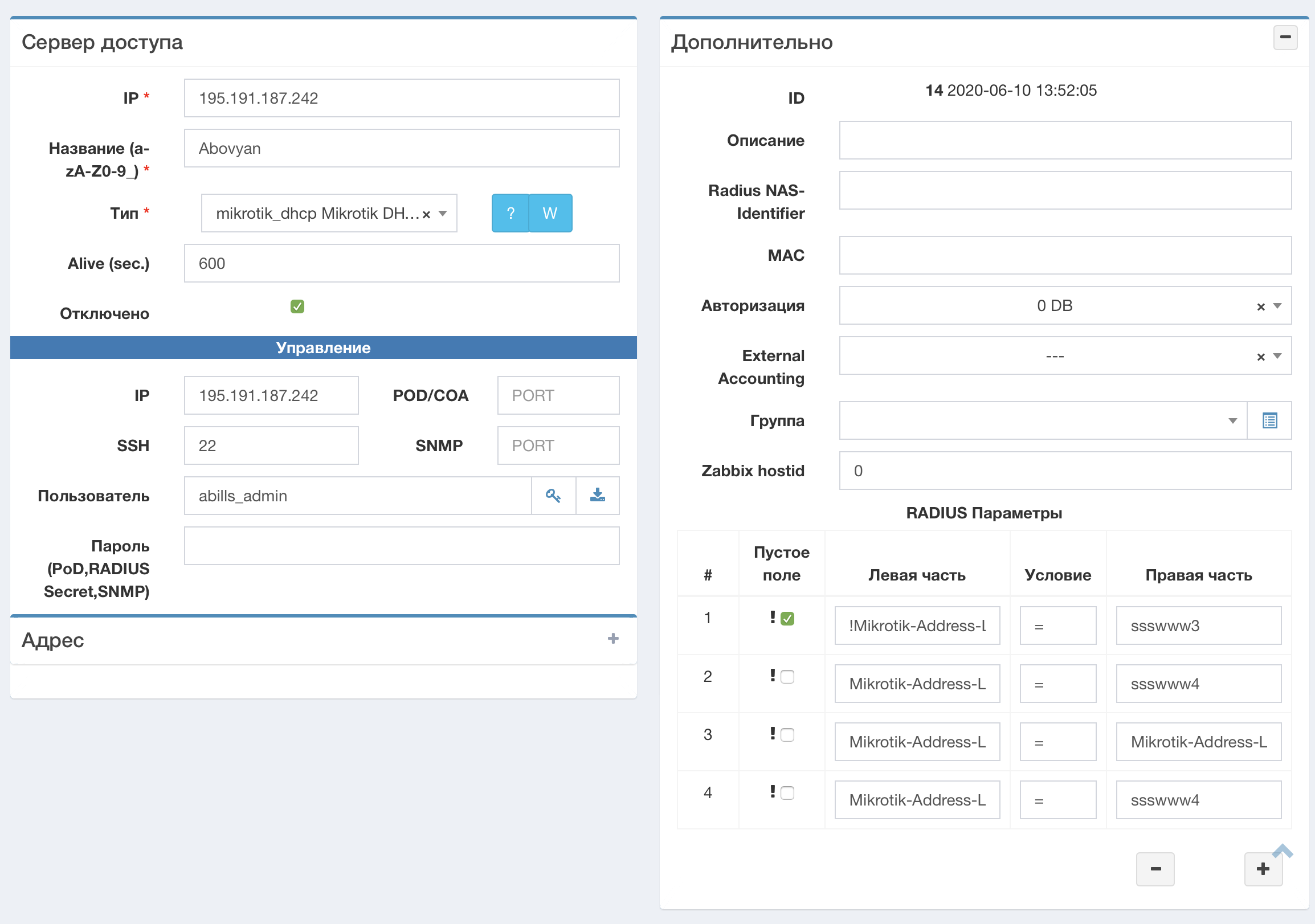 Если идет добавление со стороны API нужно прописать опцию. Предупреждение: Во время добавления или изменения сервера доступа через API Вы можете внести параметры после которых radius работать не будет, включение опции на Вашей ответственности