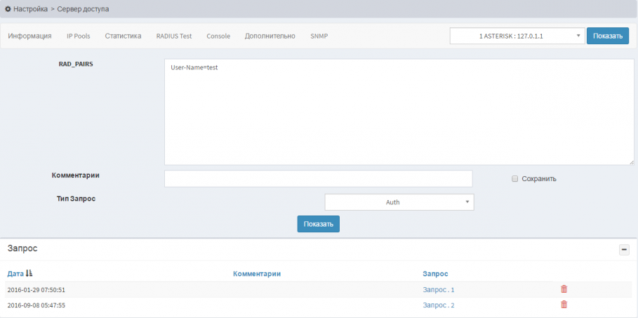 Консоль тестирование RADIUS ответов для данного сервера доступа.