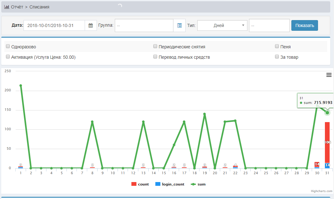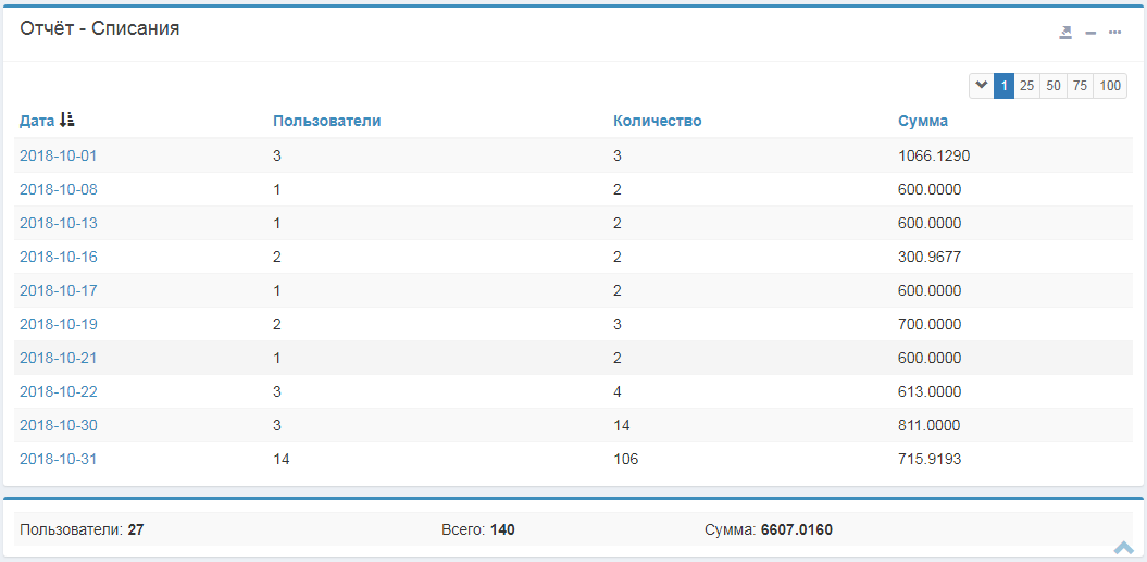 Отчёт о списании средств формируется через меню Отчёт>Списания.