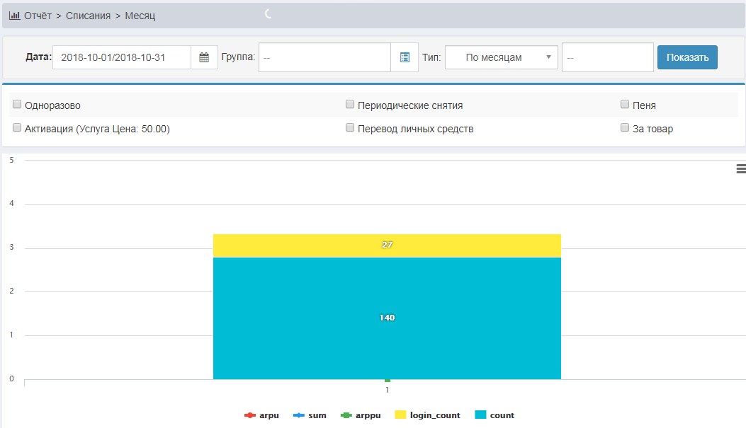 по ARPU (Средняя выручка на одного пользователя), ARPPU (Средняя выручка с одного платящего пользователя). Данные поля отображаются если указан тип отчета «По месяцам»;
