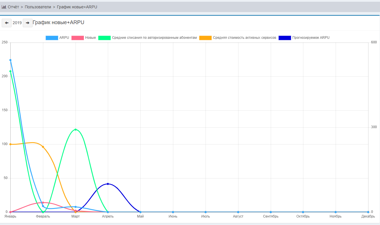 Посмотреть график можно в меню Отчёт>Пользователи>График новые+ARPU. По умолчанию график отображается за текущий год.
