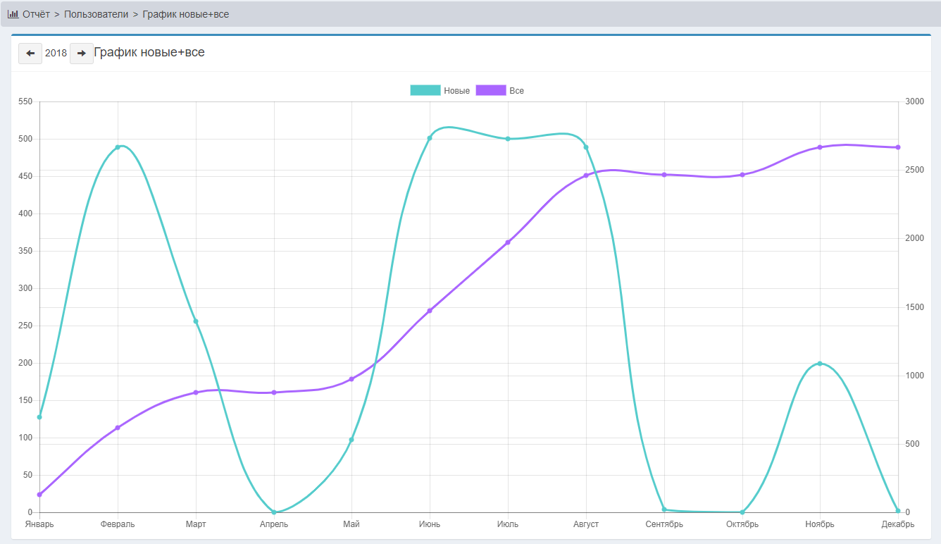 Посмотреть график можно в меню Отчёт>Пользователи>График новые+все. По умолчанию график отображается за текущий год.