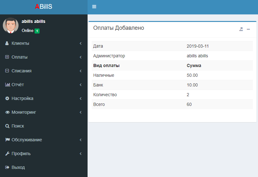 Отчёт показывает оплаты проведенные администратором за текущий день.