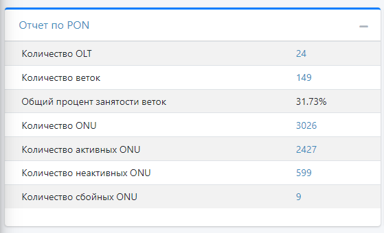 Количество ONU - общее количество ONU по всем OLT. При нажатии на ссылку переходим на Отчёт>Оборудование>PON