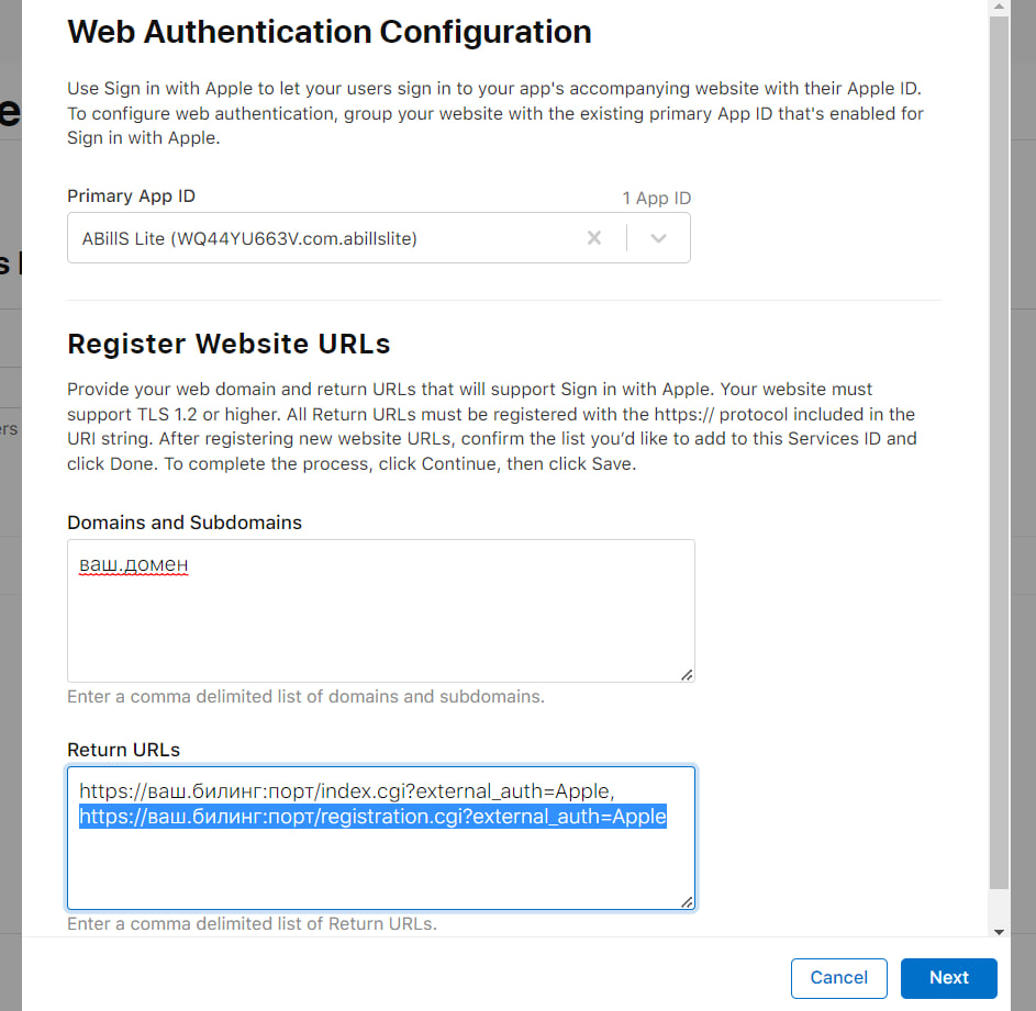Примечание: eсли вам не нужна регистрация через Apple, второй URL можно не прописывать