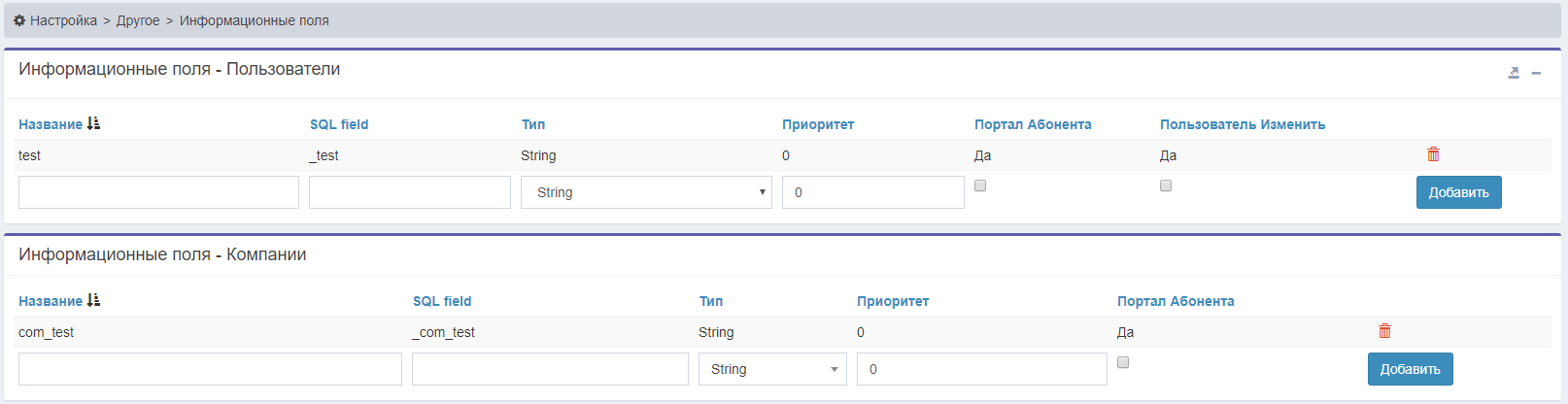 1. В старом интерфейсе добавлены поля для абонента и компании: