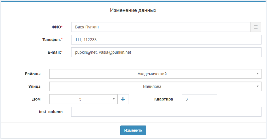 Пользователь имеет возможность изменить доступные для смены пользователем данные. Обязательные поля для заполнения: ФИО, Телефон, E-mail.