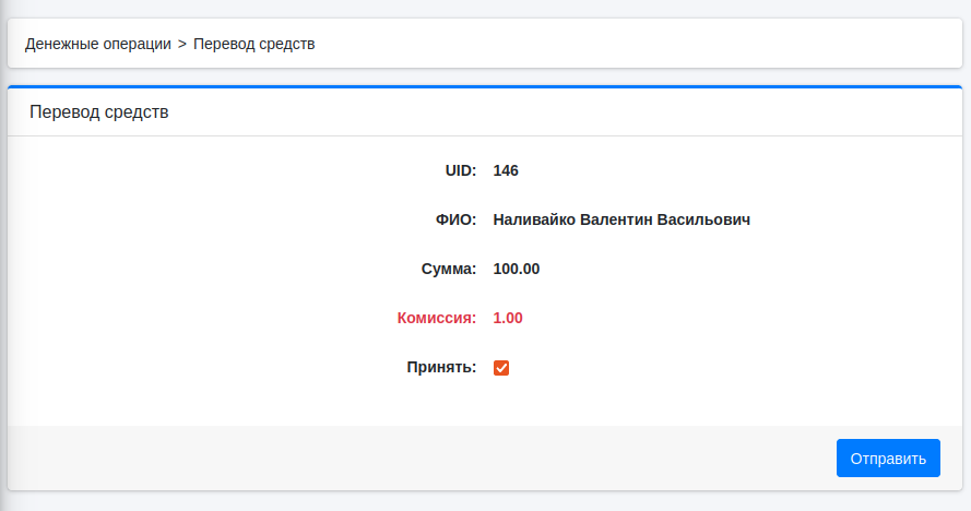 Чтобы использовать в кабинете администратора, то перейдите на карточку нужного вам абонента, и перейдите в Клиенты > Логины > Информация > Перевод средств