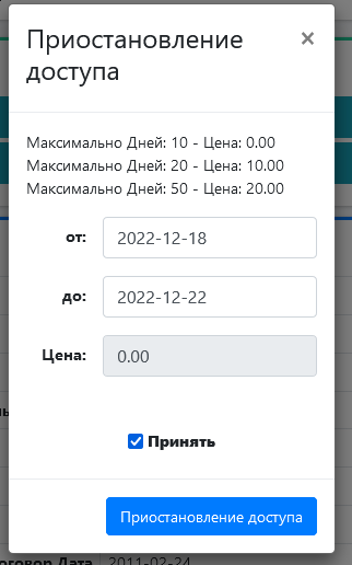 Приостановление сервиса до 10 дней бесплатно, до 20 дней за 10 условных единиц, до 50 дней за 20 условных единиц