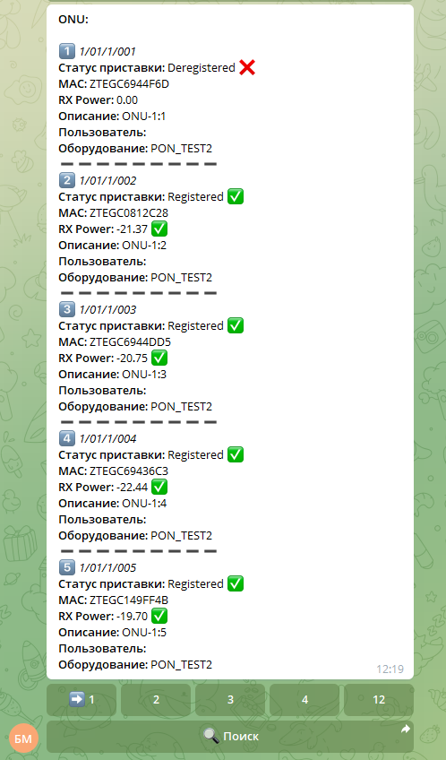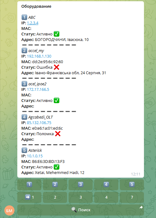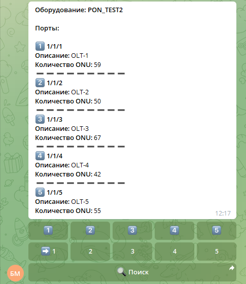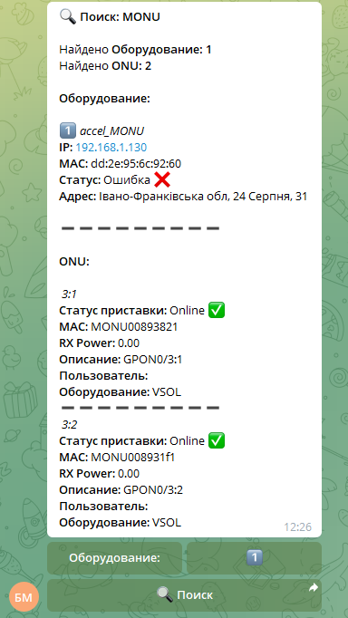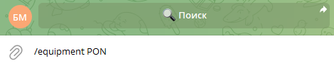 Для поиска оборудования/onu нужно нажать на кнопку Поиск и вписать ключевую фразу или прописать /equipment ключевая фраза