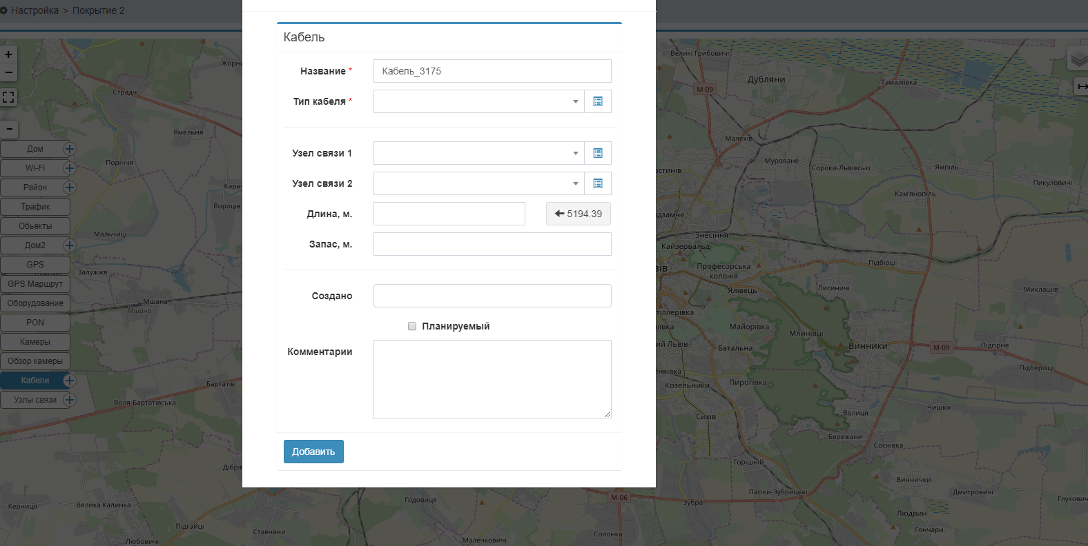 Для добавление элементов на карту нажмите на возле нужного элемента.