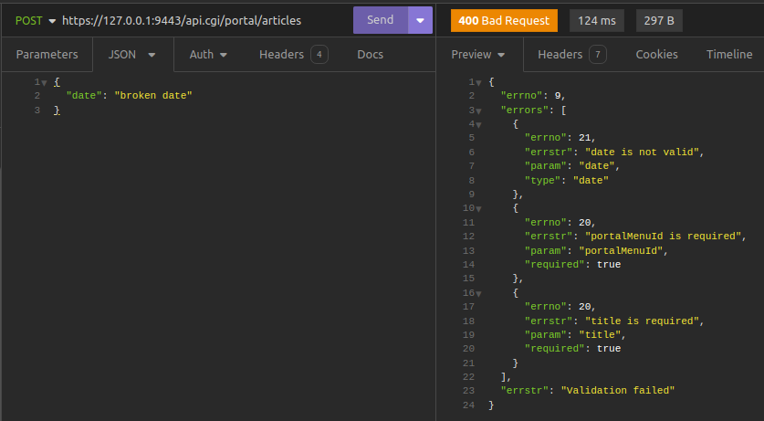 На примере создаётся реквест ADMIN RESTful JSON API, с неправильной датой и не указанием дополнительных полей, но система данный реквест не приняла, объяснив причины.