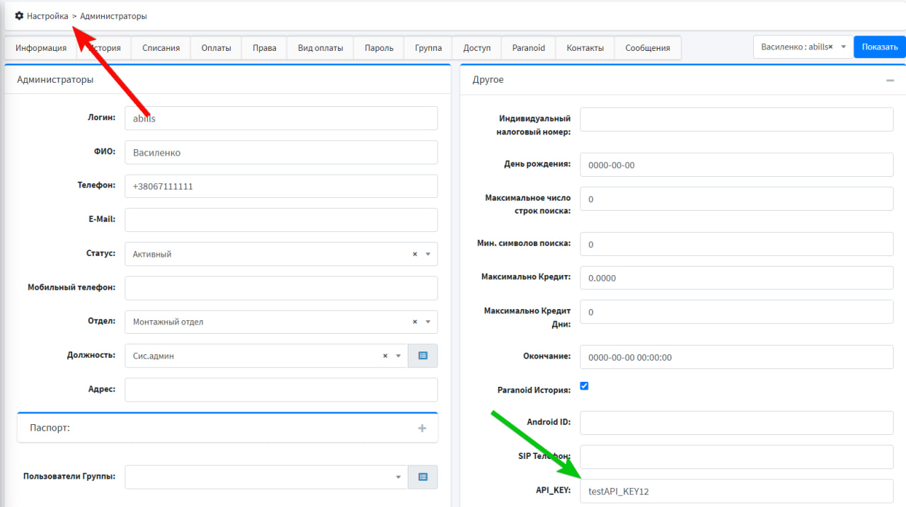 Для получения API_KEY нужно его задать через веб-интерфейс Настройки > Администраторы, поле API_KEY.